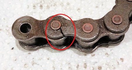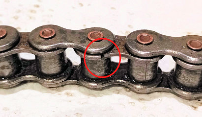 Op een deel van de kettingschakels staat "Duckworth USA" ingeslagen. Wat Googlen gaf me de indruk dat deze kettingfabrikant al lang niet meer bestaat. Het is dus blijkbaar een oude ketting, die bij de restauratie niet vervangen was. Verkeerde zuinigheid, een nieuwe ketting kost nog geen 25 euro!
